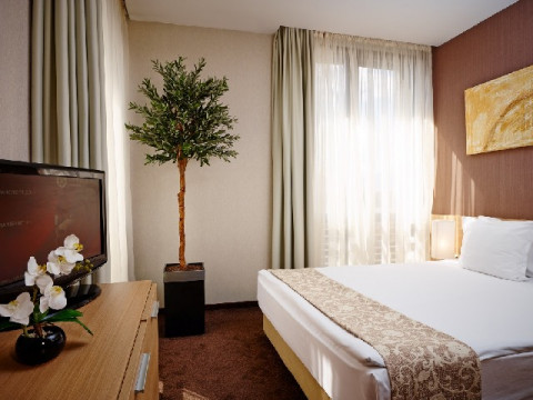 1 BEDROOM APARTMENT DELUXE: 2 приміщення: вітальня з диваном і кухонним куточком з обладнанням / кави машина, керамічна ел. плита, тостер, електричний чайник, холодильник, мікрохвильова піч, посуд і кухонне приладдя / і двомісний розкладний і тримісний нерозкладний диван; і спальня з 2 односпальні ліжка або 1 двоспальне ліжко; 1 ванна кімната з душем і ванною; макс. 2в 2р; 55 м2;