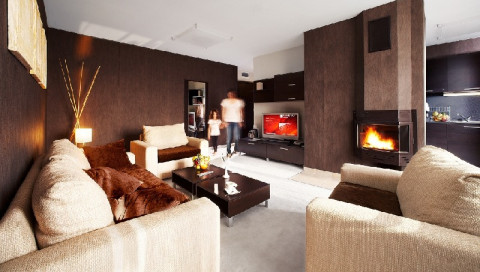 1 BEDROOM APARTMENT EXECUTIVE: 2 приміщення: вітальня з диваном і кухонним куточком з обладнанням / кави машина, керамічна ел. плита, тостер, електричний чайник, холодильник, мікрохвильова піч, посуд і кухонне приладдя / і двомісний розкладний і тримісний нерозкладний диван, камін; і спальня з 1 двоспальне ліжко; 1 ванна кімната з душем і ванною; макс. 2в 2р; 65 м2;
