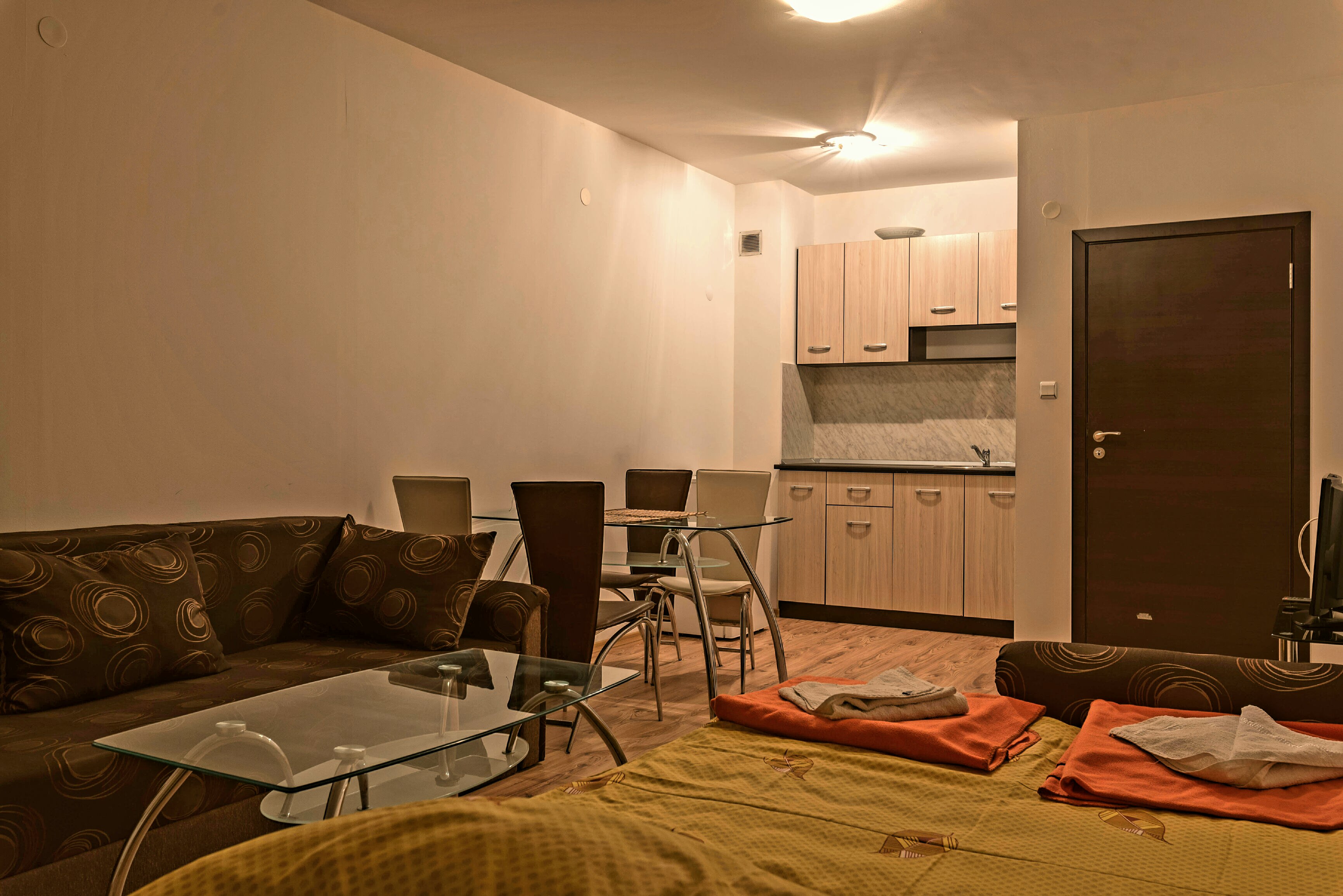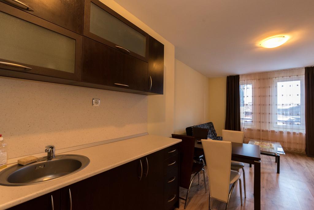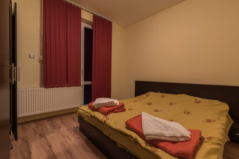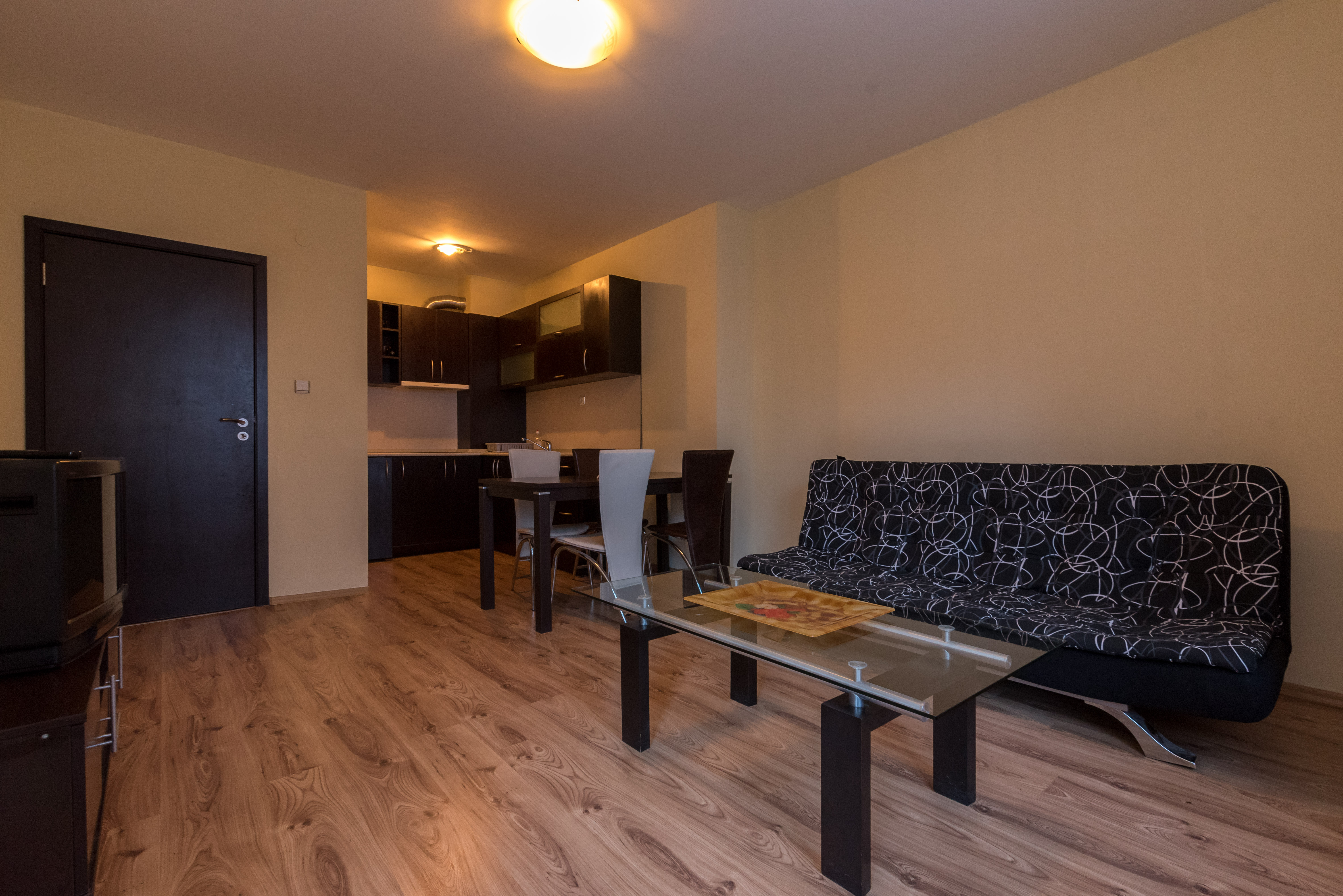 1 BEDROOM APARTMENT: 2 приміщення: вітальня з раскл. диваном і обладнаний кухонний куточок / мікрохвильова піч, електрочайник, холодильник, посуд і столові прилади /; спальня з 2 односпальні ліжка; 1 ванна кімната з душем; макс 4в; 65m²;