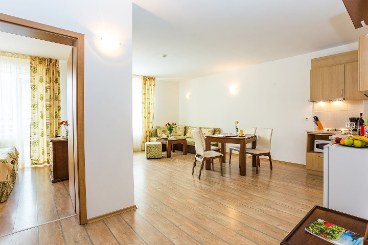 1 BEDROOM APARTMENT: 2 приміщення - вітальня з диваном і кухонним куточком; спальня; ванна кімната; макс. 2в. 2р, 3в 1р; 53 м2;