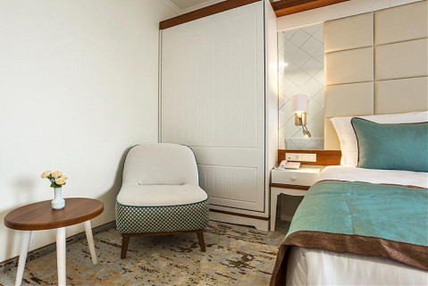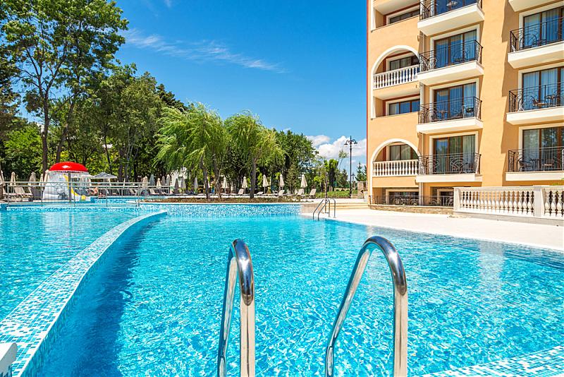 В 50м. від пляжу. 269 номери. Двомісні номери (22-25кв.м.) З балконом, студіо (35кв.м.) з балконом, апартамент (45кв.м.) з дверима між кімнатами, з або без балкона. Останній ремонт - 2018 / нове 6-поверхова будівля /.