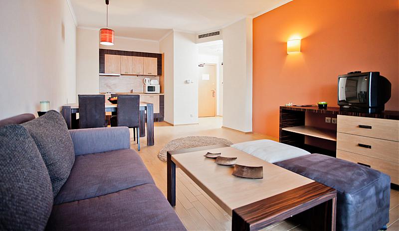 1 BEDROOM APARTMENT: 2 приміщення / деякі з них без дверей між кімнатами /: вітальня з диваном і кухонним куточком з обладнанням / плита, ел.чайник, духовка або мікрохвильовка /; спальня з двома односпальними ліжками, 1 ванна кімната з душем або ванною; макс.3в. + 2р., 3в .; 46м2;