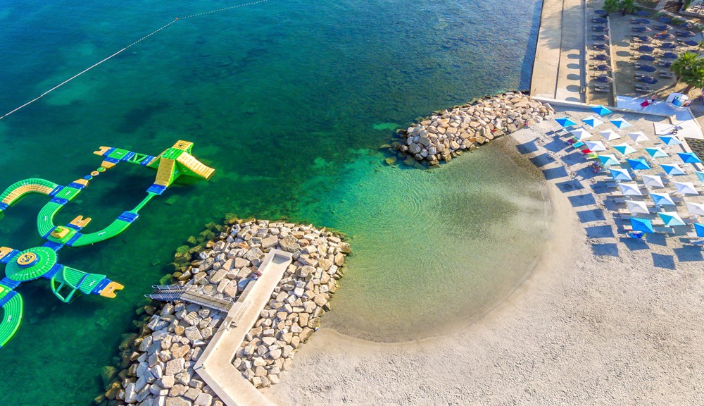 Платформа, галька і камінь, є насипний піщаний пляж з трав'яними та брукованими галявини для засмаги - в 80-150 метрах від готелю. парасольки і шезлонги - за додаткову плату; душ і кабінки для переодягання на пляжі.