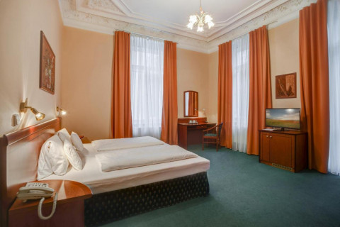 Одноместный номер (5) | Площадь номера : 15 м2 | Одноместный номер с одной кроватью | В номере ванная комната с душевой кабиной, туалетом, феном и гигиеническими принадлежностями | В номере телефон, телевизор со спутниковыми каналами (на русском, английском, немецком и чешском языках), холодильник для напитков, сейф | Бесплатный беспроводной доступ в Интернет
