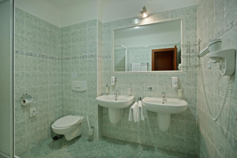 Двухместный номер (14) | Площадь номера : от 20 до 35 м2 | Двухместный номер с одной широкой или двумя отдельными кроватями, с одной ванной комнатой | В ванной комнате - душевая кабина, туалет, фен и гигиенические принадлежности | В номере - телефон, телевизор со спутниковыми каналами (на русском, английском, немецком и чешском языках), холодильник для напитков, сейф | Бесплатный беспроводной доступ в Интернет | Большинство номеров имеют балкон с видом на курортный парк