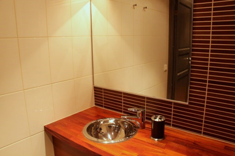 Верхній поверх 47,5м²: кімната з каміном, 2 спальні, туалет, ванна кімната і сауна. З ванної кімнати вхід на маленький балкон, з кімнати з каміном вхід на великий балкон.