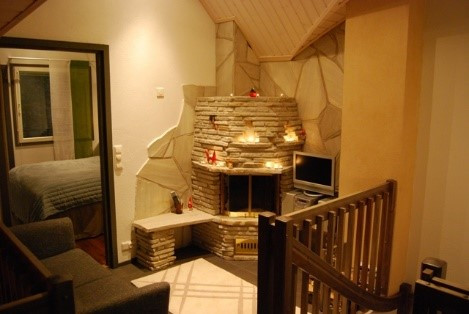 - Верхній поверх (24,5м2): комнтата з каміном, спальня, ванна кімната, туалет і сауна.