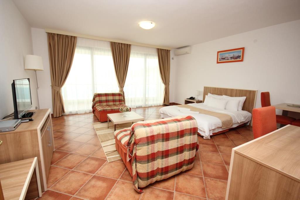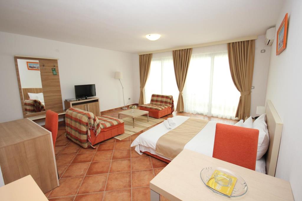 В АРР 1 BED ROOM: двокімнатний номер, в спальні французьке ліжко, в вітальні розкладний диван, міні-кухня, ванна кімната, кондиціонер, супутникове телебачення, сейф, простора тераса. Максимальне розміщення 4 людини.