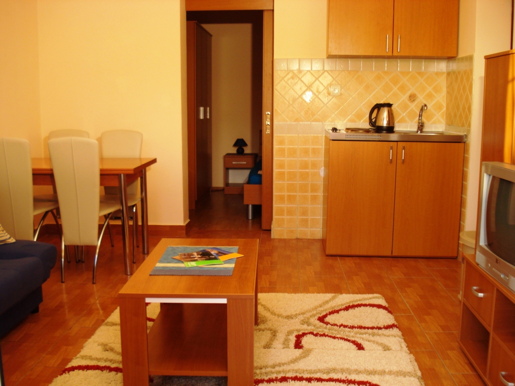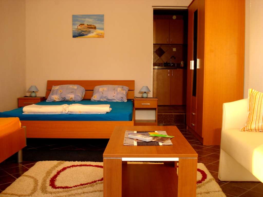 В STUD: французьке та односпальне ліжка, міні-кухня з необхідним посудом, кондиціонер, кабельне телебачення, інтернет, ванна кімната. Тераса - перед входом. Максимальна розміщення - 3 дор.