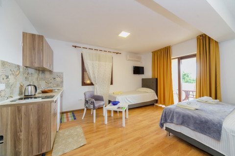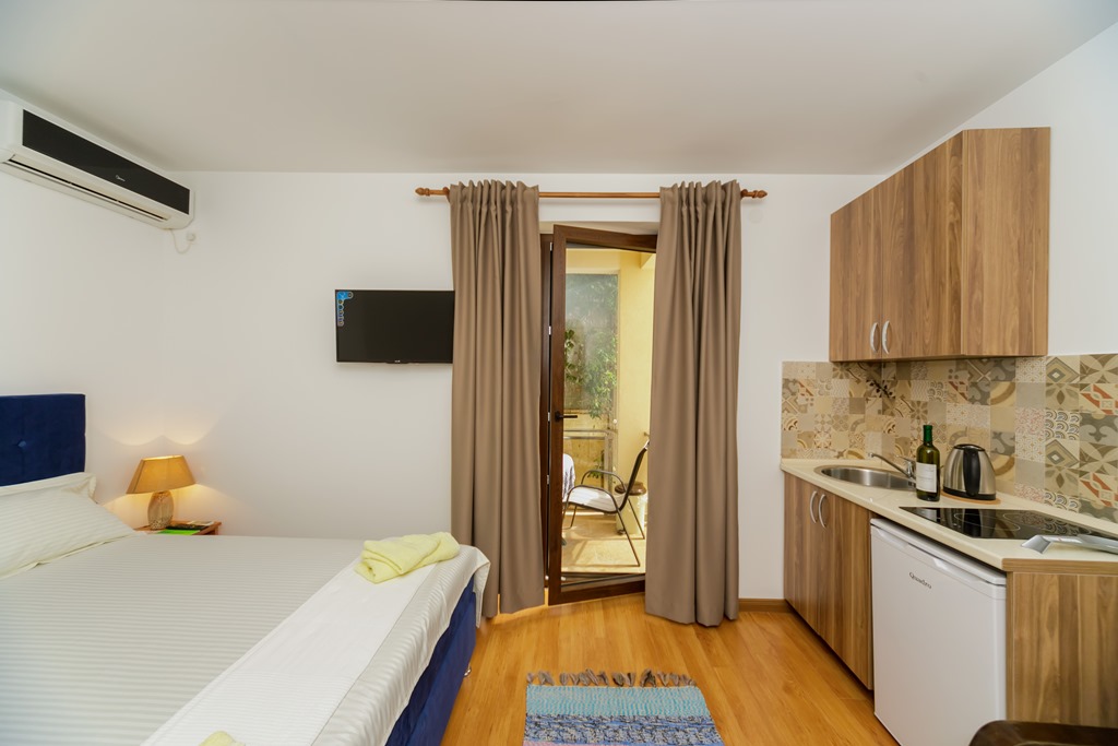 В STUD 02 ssv: французьке ліжко, кухонний куточок, кондиціонер, супутникове ТБ, Wi Fi інтернет, санвузол з душовою кабіною, балкон з частковим видом на море. №1, 2, 8, 9. Максимальне розміщення: 2 чол.