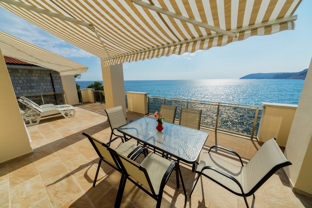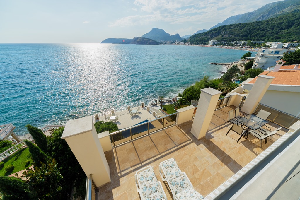 Сучасна будівля, простора тераса з прекрасним видом на море.