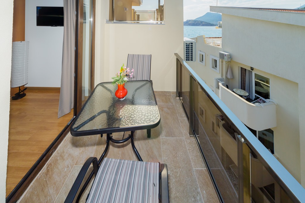 В STUD 03 sv: французьке та додаткове ліжка, обладнана кухня, кондиціонер, супутникове ТБ, Wi Fi інтернет, санвузол з душовою кабіною, великий балкон з видом на море. № 7,11. Максимальне розміщення: 3 чол.