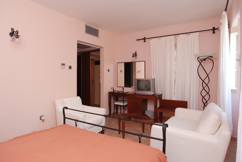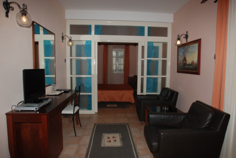 B APARTAMENT: Двокімнатний номер, в спальні французька рувати, у вітальні диван і два крісла, кондиціонер, сейф (безкоштовний), кабельне телебачення, телефон, доступ до інтернету, балкон, вид на затоку, душ/ванна, фен, косметика (32 м2). Максимальне розміщення - 4 особи.
