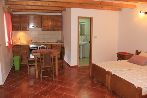 В STUD: Простора кімната з французьким ліжком, розкладним диваном і кухнею. Кондиціонер, кабельне телебачення, холодильник, набір необхідного посуду, ванна кімната, тераса перед входом. Максимальне розміщення - 4 чол.
