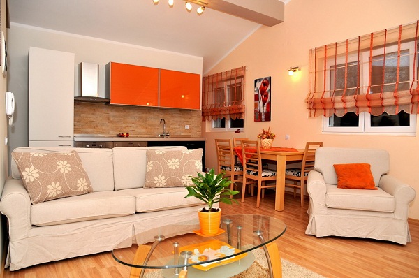 В студіо: Розташована на першому поверсі з видом на Боко-Которська затока. Має два входи, один з двору і окремо з боку тераси з басейном, в студії: розкладний диван (два дивана - при тримісному розміщенні), кондиціонер, плазмовий телевізор, Інтернет, кухня, окрема ванна кімната з душовою кабіною.