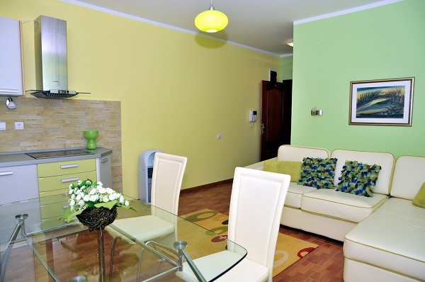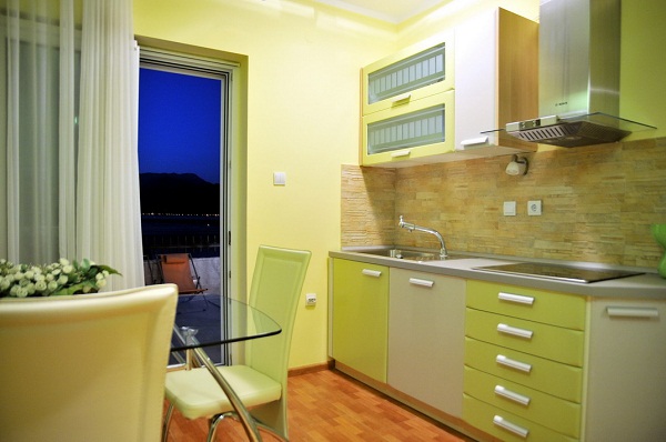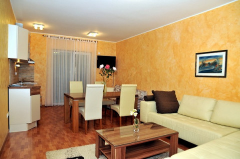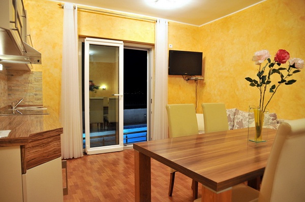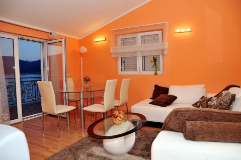 В апартаменті: Розташований на першому поверсі з видом на Боко-Которську затоку. Має два входи, один з двору і окремо з боку тераси з басейном, двокімнатний, в спальні французьке ліжко, в залі диван, кухня, обідній стіл.
