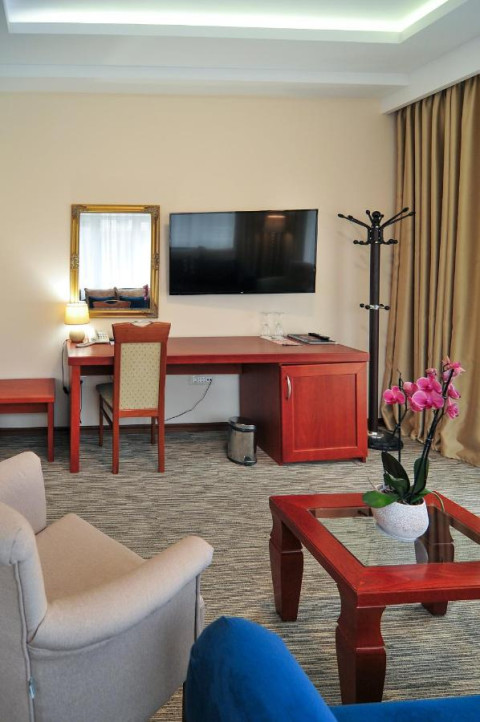 В DBL LUX: Французьке ліжко, розкладне крісло, робоче місце, ванна, кондиціонер, сейф, телефон, інтернет, фен, міні-бар, кабельне телебачення, плазмова панель.