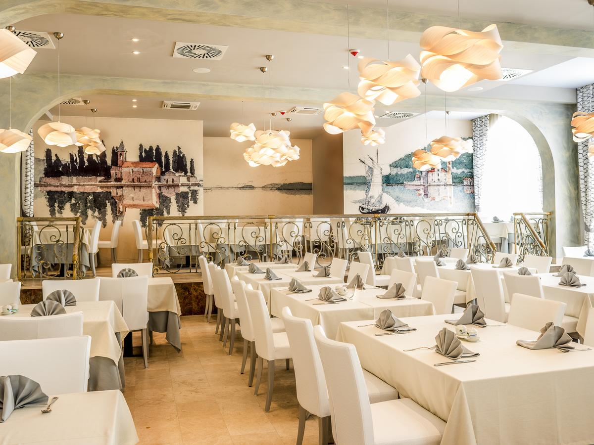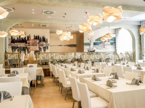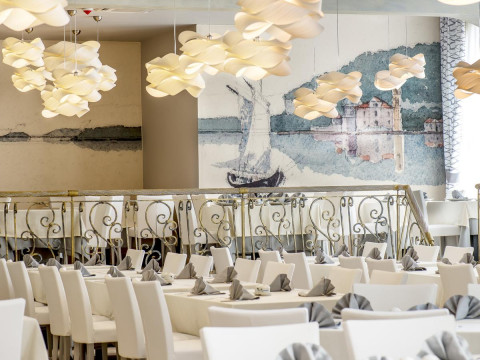 Працює на базі сніданків і напівпансіону (шведський стіл), основний ресторан на 300 місць, аперитив бар, кафе, ресторан a la carte (рибний), літня тераса для відпочинку, два конференц-зали на 25 і 50 місць, парковка. У номерах - щоденне прибирання.