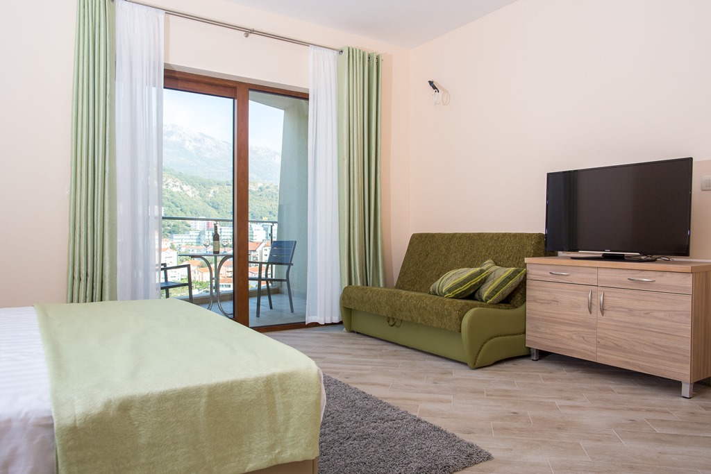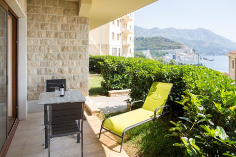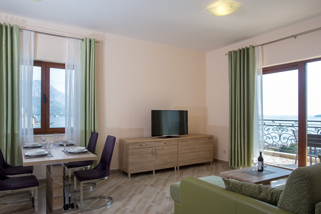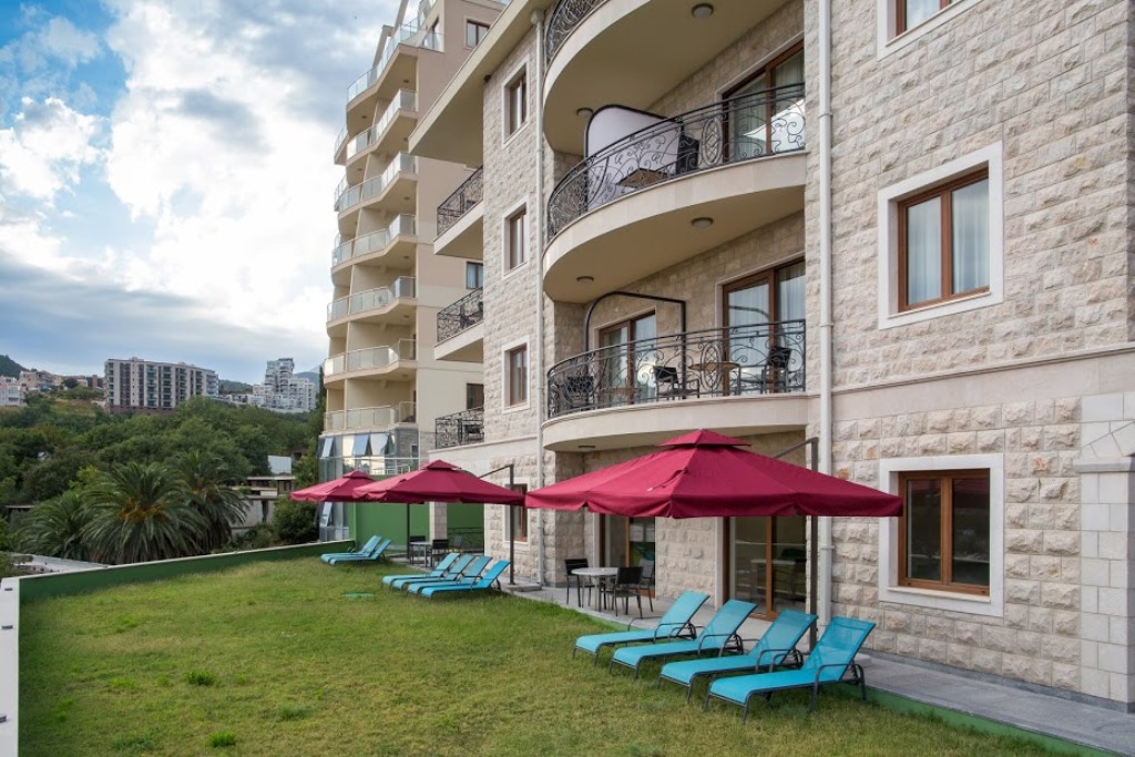 У селищі Бечічі. Апартаменти знаходяться на другій лінії, за дорогою. У 2км від Будви.