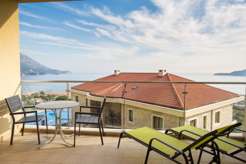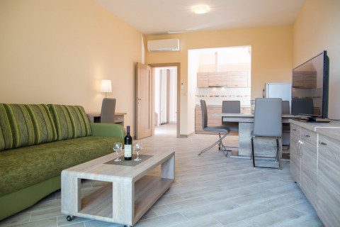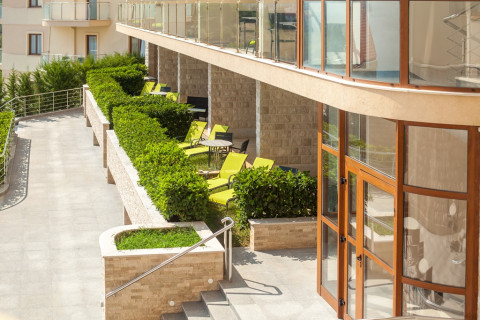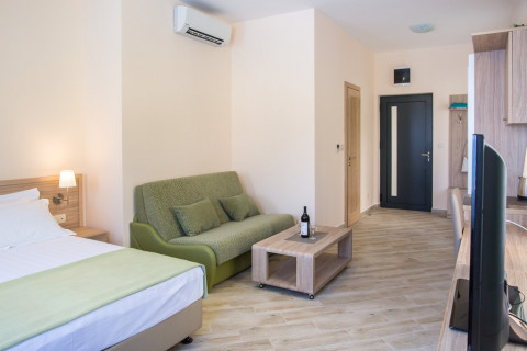 В Executive АРР SV: розташовані в головному корпусі і корпусі VILLA, в вітальні диван, що розкладається, повністю обладнана кухня, в спальні французьке ліжко, кондиціонер в кожній кімнаті, супутникове ТБ, холодильник, чайник, пральна машина, санвузол з душовою кабіною, балкон або тераса з видом на море. Площа 50-60м2. Максимальне розміщення: 5 людини.