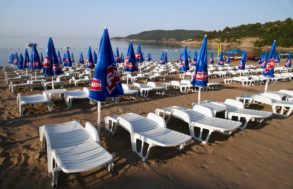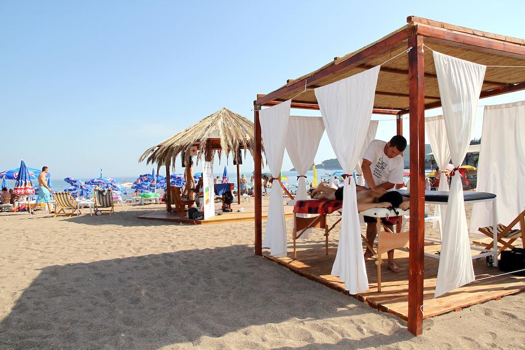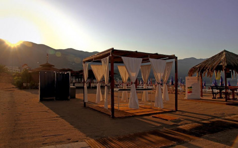 В 150м від піщано-галькового власного пляжу Бечічі (комплект з двох лежаків і парасольки - 6 євро), куди можна дістатися по надземному переходу.