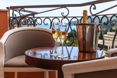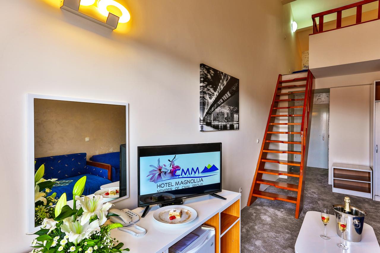 В SUITE JUNIOR DUPLEX: Дворівневий номер, вітальня знаходиться на першому рівні, а спальня - на другому. У спальні є два окремих ліжка, у вітальні - розкладний диван та крісло, двері між спальнею і вітальнею немає. В апартаменті також є санвузол з душовою кабіною, фен, кондиціонер, міні-бар, кабельне ТБ, бездротовий інтернет, балкон з набором садових меблів. У зв'язку з наявністю в готелі напівпансіону кухня відсутня. Дитяче ліжко надається при необхідності безкоштовно. Максимальне розміщення - 4 людини.