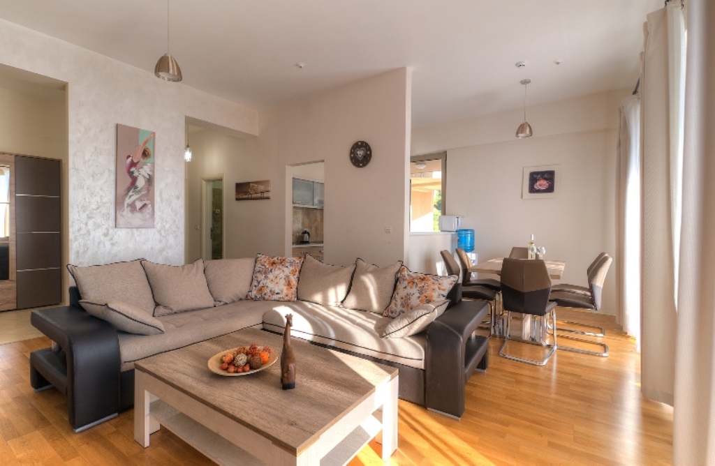 В SUP АРР SV, 2 BR: Площа: 85-90 м2. Вітальня з диваном, спальня з французьким ліжком і спальня з двома роздільними ліжками, міні кухня (електроплита, чайник, холодильник), кондиціонер, інтернет Wi Fi, широкоформатний ТВ, санвузол з душовою кабіною, пральна машина, тераса з видом на море. Максимальне розміщення: 6 дор.