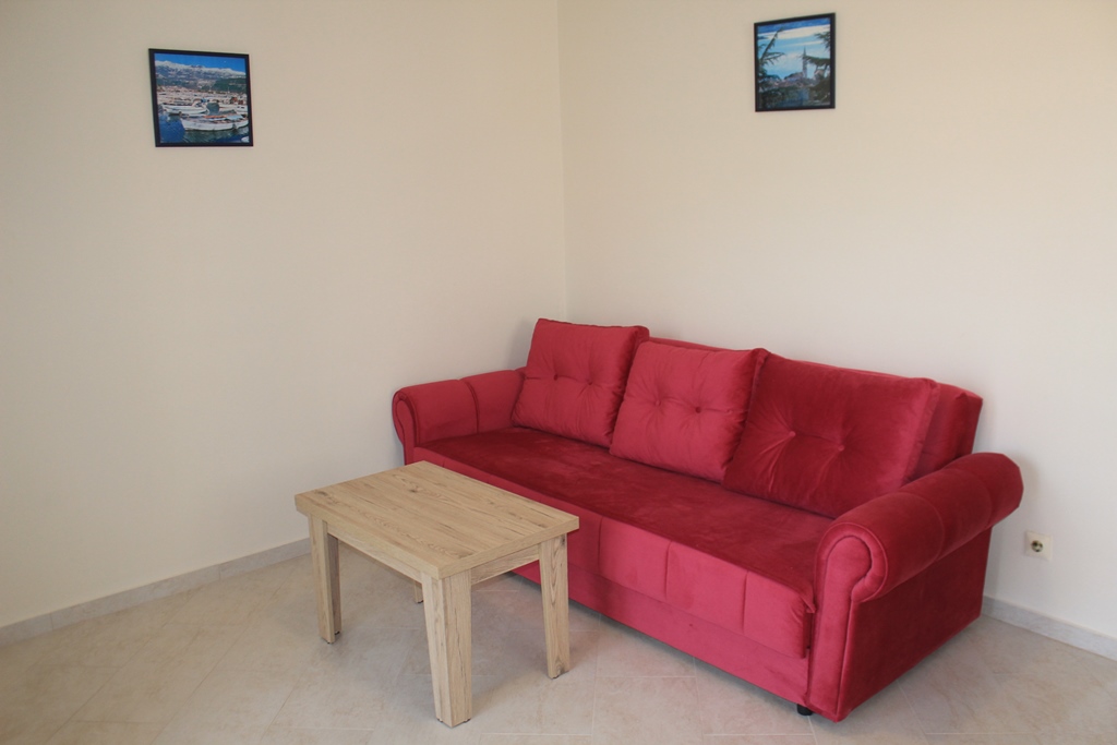 В APP: Спальня з французьким ліжком і вітальня з розкладним диваном, кондиціонер, кухонний блок з холодильником, обідній стіл, електрочайник, балкон з видом на море, кабельне телебачення, душ.