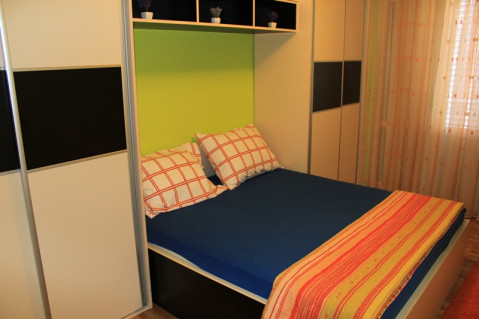 У спальні - французьке ліжко, шафа, телевізор (плазма), кондиціонер, вихід на балкон.