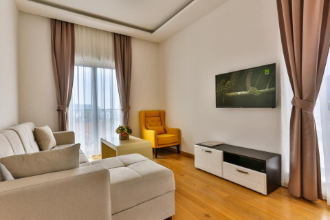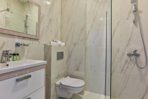 В Stud APP: французьке ліжко, софа, кондиціонер, супутникове ТБ, Wi Fi інтернет, сейф, міні бар, санвузол з душовою кабіною, фен, балкон з видом на місто. Максимальне розміщення: 3 дор. Площа 28 м2.