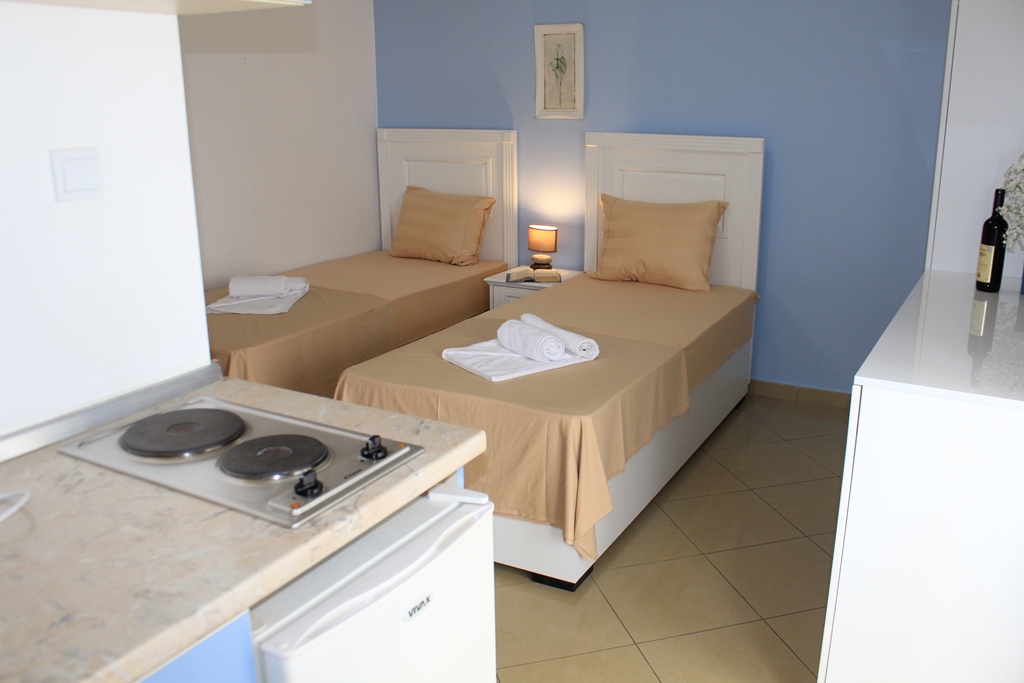 В STUD 02: двоспальне або роздільні ліжка, кондиціонер, холодильник, міні-кухня, електрочайник, сейф, фен, балкон, душова кімната, кабельне телебачення.