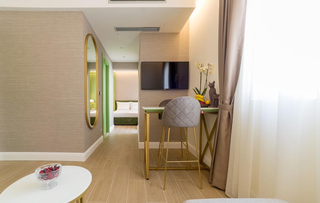 В АРР: вітальня з диваном, в спальній зоні французька або окремих ліжка, кондиціонер, супутникове ТБ, Wi Fi інтернет, міні бар, сейф, санвузол з душовою кабіною, фен, халати, тапочки, балкон. Максимальне розміщення: 2 чол + інфант. Можливе розміщення третього людини за додаткову плату.