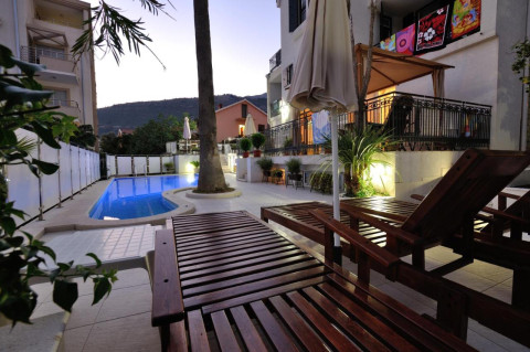 LUX SUITE: Aпартаменти розташовані на першому (3,4), на другому поверсі (13,14) і в мансарді (23,24) будівлі C. Вони складаються з двох окремих приміщень, але великих за площею. У першій кімнаті є диван, який може розкладатися, кухня з холодильником. Друга кімната - спальня з двоспальним ліжком (160х200), 32 '' LCD телевізор з супутниковими і місцевими каналами, письмовий стіл, шафа-купе, сейф, AC. Номери 4, 14, 24 розгорнуті до моря, а номер 24 має прекрасний вид на море завдяки тому, що знаходиться на достатній висоті. Номери 3, 13, 23 мають вигляд на двір зі своїх балконів. Максимальне розміщення - 4 людини.
