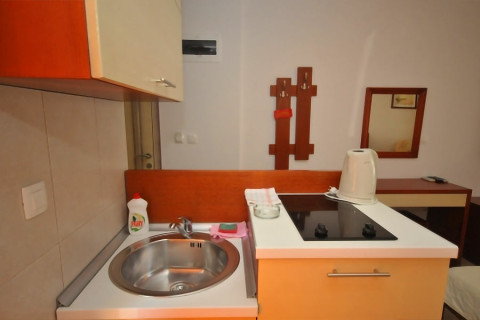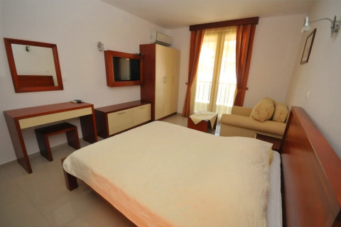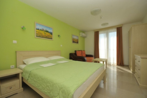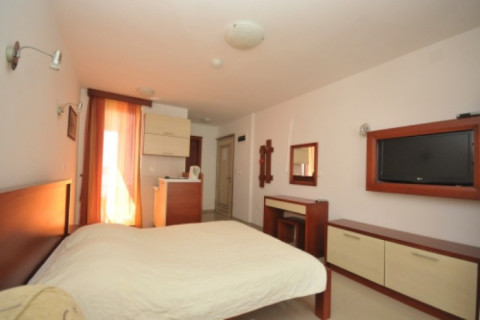 Studio 03 superior sv (№16,17,21,22,23): 24 м2, терраса 4-6 м2 с прямым видом на море, французская кровать (160x200cm) + раскладной диван (120×200cm), мини-кухня (комплект посуды, электрический чайник, варочная панель), ванная комната с душем. Максимальное размещение — 3 человека.