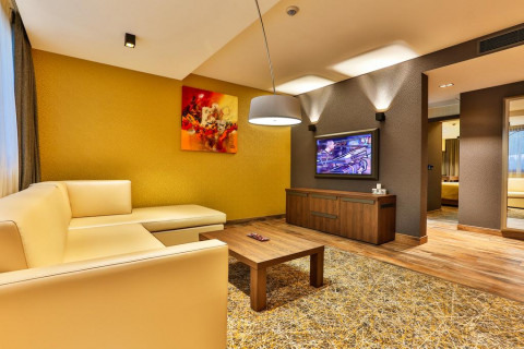 В Junior Suite SV: вітальня з розкладним диваном, повністю обладнана кухня, столова зона та зона відпочинку, у спальні французьке ліжко, кондиціонер, супутникове ТБ, Wi Fi інтернет, міні бар, сейф, телефон, апарат для приготування чаю та кави, чайник, санвузол з душовою кабіною, фен, капці, балкон з видом на море. Максимальне розміщення: 4 особи. Площа: 65 м2.