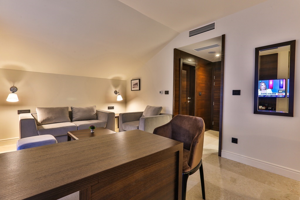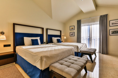 В Deluxe Suite SV: окремі ліжка та софа, зона відпочинку кондиціонер, супутникове ТБ, Wi Fi інтернет, сейф, міні бар, електричний чайник, санвузол з душовою кабіною, тераса з видом на море. Максимальне розміщення: 2+2 чол. Площа: 76 м2.