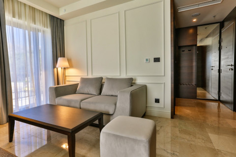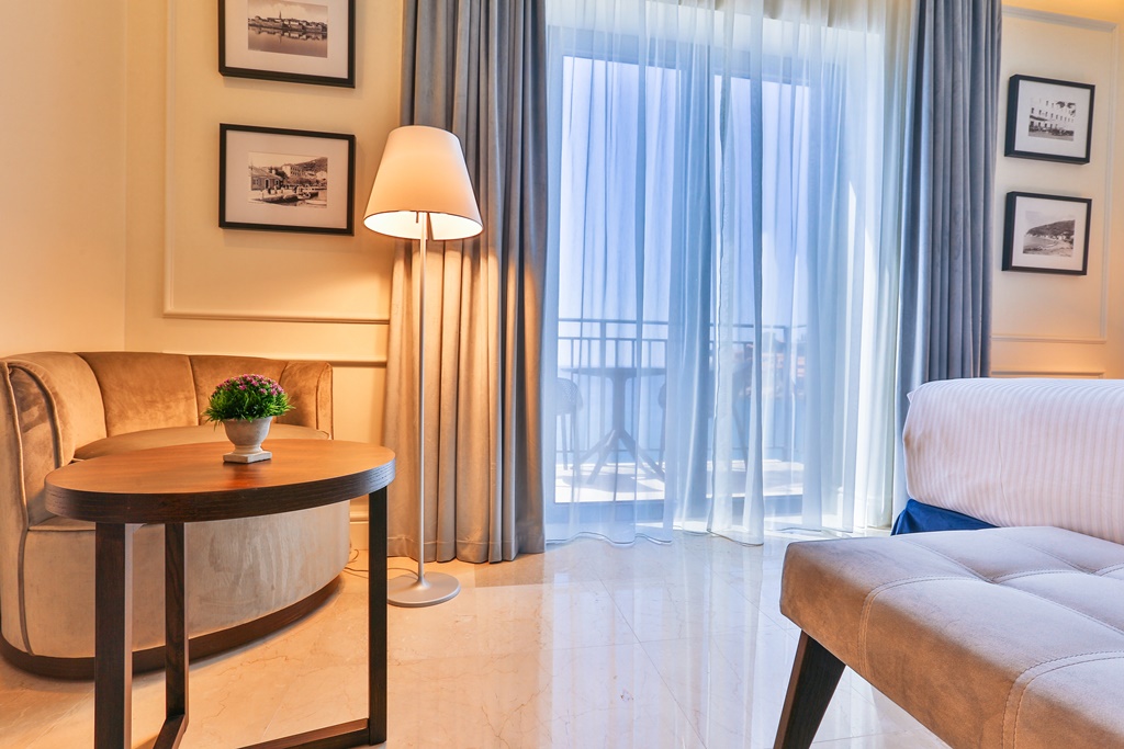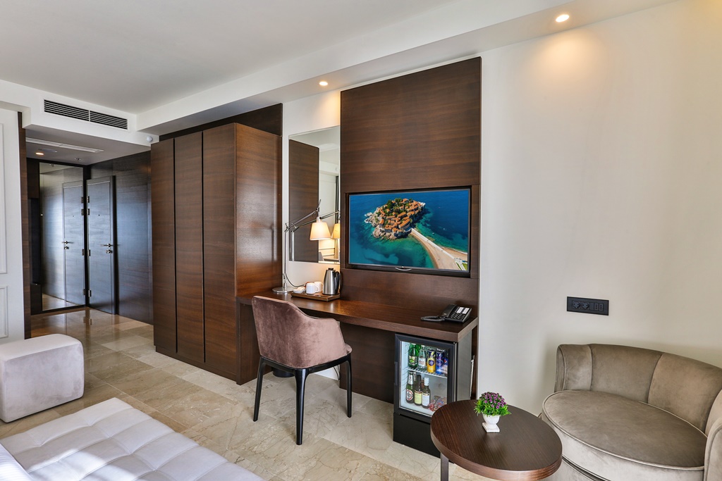В Deluxe DBL SV: французьке ліжко та софа, кондиціонер, супутникове ТБ, Wi Fi інтернет, сейф, міні бар, електричний чайник, санвузол з душовою кабіною, балкон з видом на море. Максимальне розміщення: 2 чол. Площа: 43 м2.