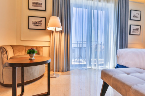 В Junior Suite MV: французьке ліжко та софа, зона відпочинку, кондиціонер, супутникове ТБ, Wi Fi інтернет, сейф, міні бар, електричний чайник, санвузол з душовою кабіною, тераса з видом на гори. Максимальне розміщення: 2+2 чол. Площа: 36 м2.
