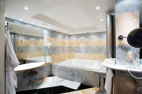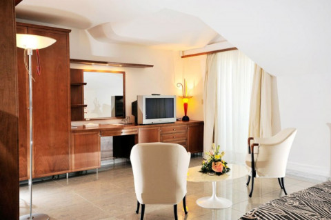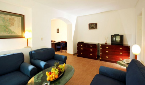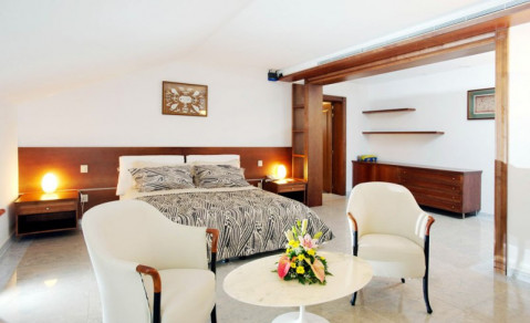 JUNIOR SUITE № 104: Розміщення 2+1 pax. Передпокій, вітальня та спальня. У салоні двомісний диван з кріслами, журнальний столик, міні-бар, телевізор, телефон, кондиціонер, сейф. Вихід на загальні тераси. У спальні двоспальне ліжко, телефон, телевізор, міні - бар. Вихід на загальну терасу. Дві ванні кімнати. У ваннах - душова кабіна. (57 м2).