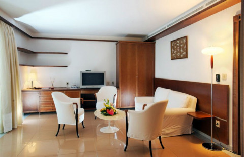 GARDEN SUITE № 106: Розміщення 2+1 pax. Передпокій, вітальня і спальня. У салоні двомісний диван з кріслами, журнальний столик, міні-бар, телевізор, телефон, кондиціонер, сейф. Вихід на загальні тераси. У спальні двоспальне ліжко, телефон, телевізор, міні - бар. Вихід на загальну терасу. У ванній кімнаті - душова кабіна. (51,20 м2).