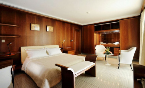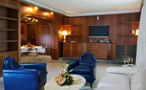 ROYAL SUITE №105: Розміщення 4 pax. Передпокій, кухня, велика вітальня, дві спальні. Вхід а апартамент з коридору або ліфта, за допомогою кодової електронної карти. Повністю обладнана кухня. На стіні плазма екран і сураунд система CDі видио. Вихід на власну терасу, яка розташована уздовж всього апартаменти. У великій спальні двоспальне ліжко 2000 x1700, плазма екран і сураунд система з відео і CD, сейф, телефон і вихід на терасу. У меншій спальні ліжко 2000 х 1700, телевізор з DVD, телефон і велике вікно, без виходу на терасу. В апартаментах 2 ванні кімнати і туалет. Велика ванна кімната з джакузі. (156 м2).