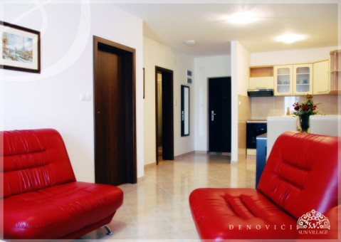 В апартаменті: Спальня з великою французьким ліжком, простора вітальня з вбудованою, повністю укомплектованою кухнею, їдальня. Кондиціонер, кабельне телебачення, інтерфон, холодильник, бездротовий інтернет, ванна кімната з душовою кабіною, велика тераса з видом на море.