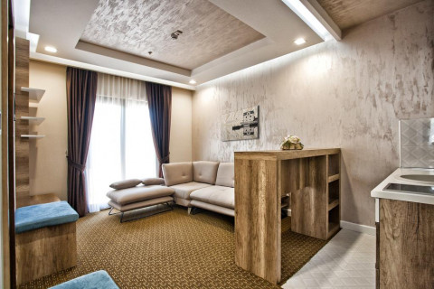 У JUNIOR SUITE: вітальня з шкіряним гарнітуром, дві спальні, одна з французької, інша з роздільними ліжками, кондиціонер, Wi Fi інтернет, супутникове ТБ, сейф, міні бар, чайник, повністю обладнана кухня, санвузол з душовою кабіною, халати, тераса з видом на парк. Максимальне розміщення: 6 чол. Площа: 41 м2.
