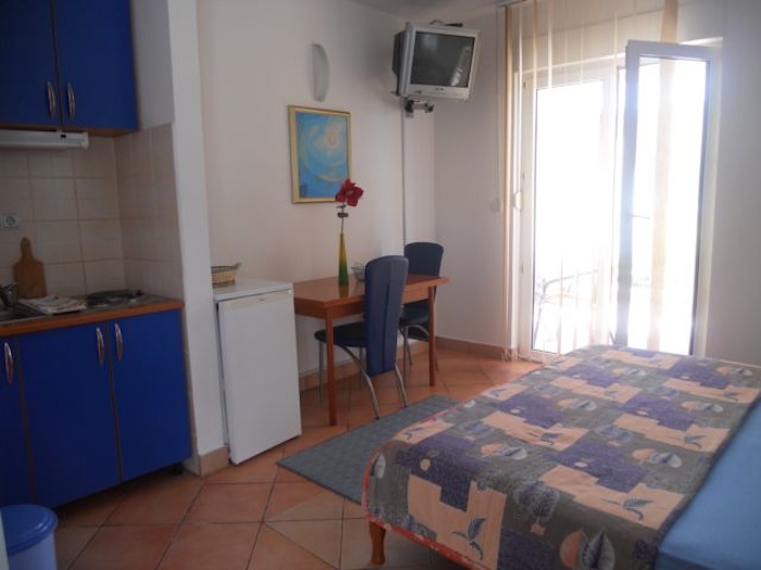 У STUD 02: Французька ліжко, кухня, холодильник, чайник, душова кабіна, туалет, кондиціонер, інтернет, фен, праска, супутникове ТБ, на балконі - стіл з 2 стульяміі, два шезлонга і парасольку від сонця (21 м2).