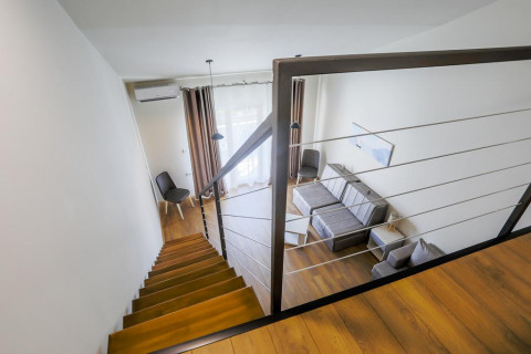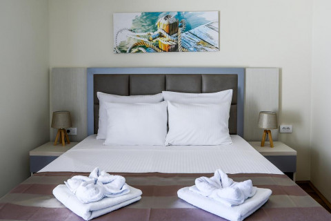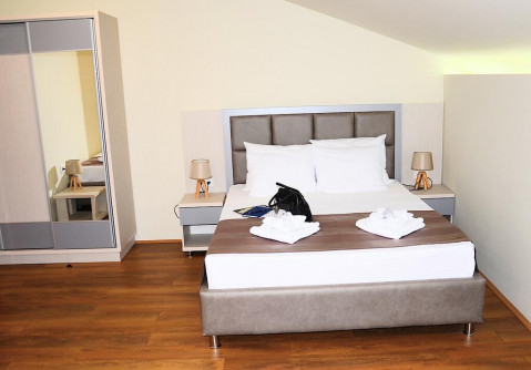 В STUD 02-04: дворівневий номер - дуплекс, на верхньому рівні французьке ліжко, на нижньому рівні розкладний диван та крісло, кондиціонер, супутникове ТБ, WI FI інтернет, міні бар, санвузол з душовою кабіною, балкон з видом на море. Максимальне розміщення: 2 дор + 3 дит.