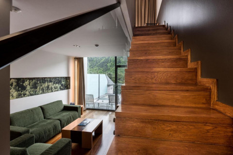 Duplex (80 м2 + 12м2, макс. 4+0 чел.) двухуровневый номер: на первом этаже - гостиная с диван-кроватью, с телевизором и большой террасой, отдельная кухня и ванная комната; на верхнем этаже - спальня с двуспальной кроватью (или 2 односпальные кровати, 100х200 см), гостевой туалет, кофемашина Nespresso, туалетные принадлежности, выбор подушек, терраса с панорамным видом на долину Валира.