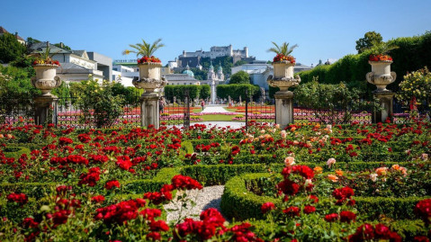 Сад роз с цветниками из декоративных роз раскинут вдоль южной стены Дворца Мирабель.