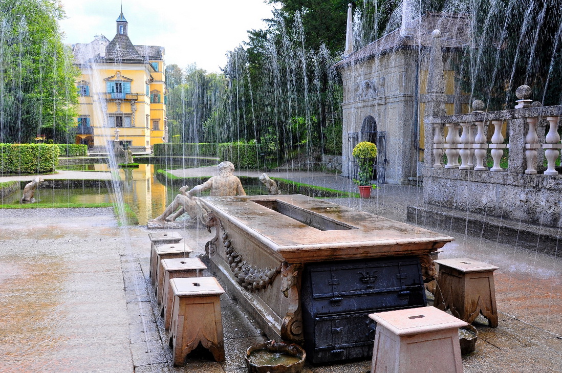 Идиллическое месторасположение на южной окраине Зальцбурга великолепно подходило также и в другом отношении: полноводная гора Хельбрунн позволила сделать воду определяющим изобразительным элементом. Центральное место занимают Потешные фонтаны в стиле маньеризма, которые в наше время являются единственными в своём роде. Различные гидравлические автоматы - от механического театра, брызгающих водой оленей до танцующей на водной струе короны – поражают своей оригинальностью и удивительными эффектами.