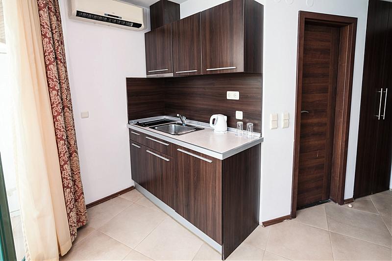 STUDIO: одно помещение, oдна двуспальная кровать или две односпальные, оборудованный кухонный уголок с посудой, плитой, эл.чайником; ванная комната с душем; макс. 2в.; 40 кв.м.; В некоторых студио есть дополнительно духовка или тостер!