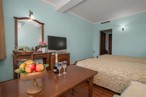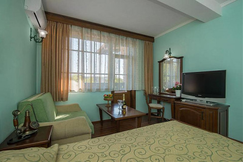 В курортном поселке Кранево, в 200м. от пляжа. 19 номера/15 двухместных номеров, 4 апартамента/.